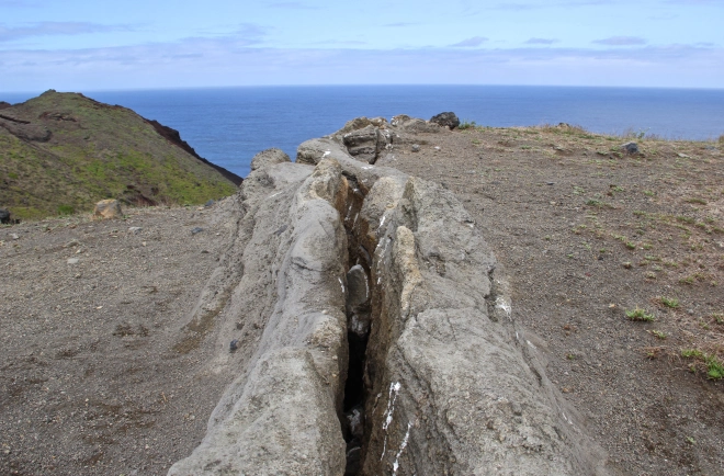 We pass a huge crack in the ground and see the steam rising from it. The fumes that escape from volcanos consist mostly of water (steam) and can be emitted from the hot interior even when the volcano is dormant. The steaming usually increases dramatically as magma intrudes and heats the groundwater beneath a volcano. Magma gives off carbon dioxide and hydrogen sulphide that do not totally dissolve in groundwater and can therefore show up at the surface. It is the hydrogen sulphide that gives the steam the ‘rotten egg’ smell that was so pungent at Furnas in Sao Miguel. Here the smell is not very strong as there is only a little steam being emitted.